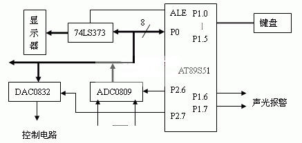 P1.0 " P1.5作为键盘的接口,连接一个2×4的键盘。分别实现液位上、下限显示、液位上、下限的设定等功能。显示器由4位LED组成,用于实时显示各个液位的高度,以及显示液位的上、下限值。