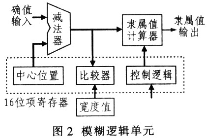 2.2 确值输入向模糊逻辑量的转换确值输入向模糊逻辑量的转换是通过测量距离的相似判决模糊逻辑单元实现的,在相似判决模糊逻辑单元内求取隶属值的电路结构如图2所示。模糊逻辑单元内被选定的隶属函数中心点值和确值输入送进减法器计算出差值ac,该差值与隶属函数宽度值相比较,只有当差值在宽度范围内时,隶属值计算器才输出结果(该结果等于从允许的最大隶属值中减去差值ac,如图1所示),否则,隶属值计算器输出将被置零或置最小值。隶属值实际上是1个模糊逻辑量,用μ(或d)表示。