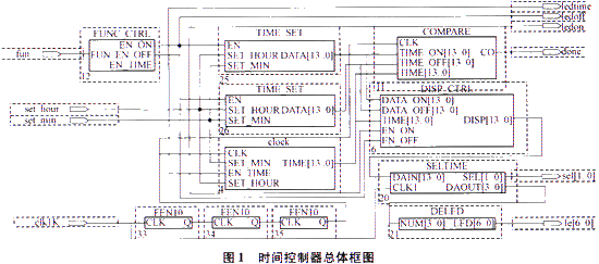 时间控制器主要由CLOCK(数字时钟)、TIMESET(定时器开启时间和关闭时间设置)、COMPARE(比较输出)、FUNC-CTRL(功能控制模块)和显示输出控制模块等组成。