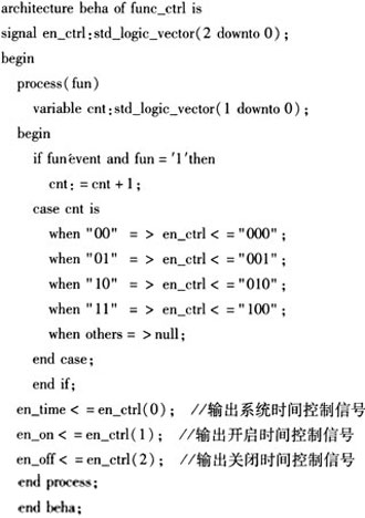 利用功能转换键(fun)使系统处在不同的功能状态:系统时间校对状态、开启时间设定状态、关闭时间设定状态、正常显示状态。利用功能转换键实现4个功能状态之间循环变化,并产生相应的控制信号(en_time、en_on、en_off)去控制CLOCK模块、TIME_SET、模块和DISP_CTRL模块等。在调整过程中,只有被选择到的功能状态指示灯被点亮,其他灯不亮,在正常模式状态下,状态灯都不亮。