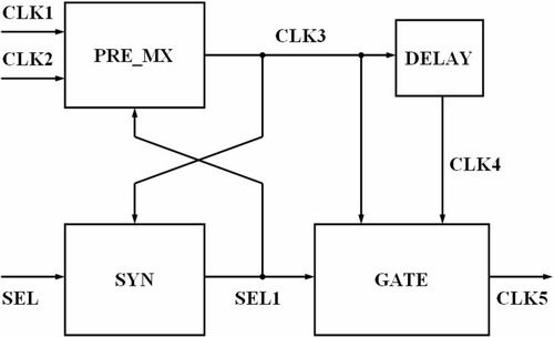 GCM的原理框图如图3所示。用普通二选一电路(PRE_MX)初步切换得到的时钟CLK3同步外界输入的时钟选择信号SEL;得到的同步选择信号SEL1实际控制时钟的切换,同时SEL1再经过进一步同步得到屏蔽残缺周期的门控信号;最后用门控信号去除时钟切换中的不稳定部分,得到平稳的时钟输出。