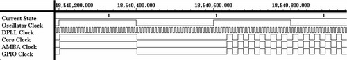 PMC时钟功耗管理控制器采用RTL级的Verilog HDL进行描述。使用A720T内核仿真模型、AMBA总线和中断控制器等功能模块的RTL级Verilog代码,以及本设计的源代码,共同组成完整的仿真环境。其中A720T内核是ARM公司设计的一款ARM7系列内核,在ARM7TDMI基础上增加了虚拟地址与物理地址转换器MMU、指令Cache和数据Cache。A720T内核仿真模型是ARM公司提供给授权开发机构用以完成仿真的功能模型,它不能被综合,只能用于功能验证。使用Synopsys公司的EDA工具VCS对本设计的功能进行仿真和验证。其中GCM模块还使用HSIM进行了SPICE晶体管级的模型仿真。GCM时钟切换的仿真结果如图4所示,PMC时钟变频和工作模式切换的仿真结果如图5所示,PMC进入IDLE节能模式的仿真波形如图6所示。从仿真结果可以看出,PMC能够正常完成预计功能,可以稳定地改变时钟频率,并根据工作模式开关时钟。