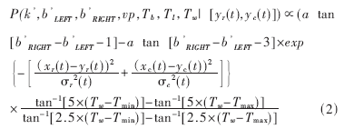 的实时估计,σc2为相平面内一个路宽的值(3.2m)。tan-1的压缩比率在相平面内不小于Tmin(路宽的一半),不大于Tmax(路宽)。通过求解七维后验pdf P(k’,b’LEFT,b’RIGHT,vp,Tb,Tl,Tw|[yr(t),yc(t)],Observed Image)的最大值获得障碍和道路目标。