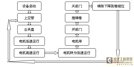 HXFA368条并卷联合机主要由成卷部分、牵伸部分、电气控制柜组成,结构简洁紧凑,在纺织备中起着承上启下的作用,其部分工作流程见图1: