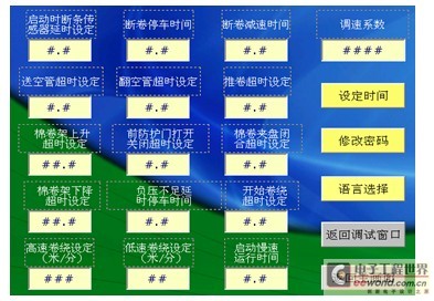 根据画面显示信息量采用十八个画面,各画面之间通过触摸键进行切换,同时触摸屏上各类组件的内存单元和与PLC中数据存储区的的单元相关联,构成系统整体监控。根据设备工艺要求设计了参数设定、系统调试、故障信息查询参数设定等画面。