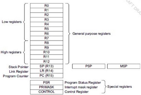 至于编程模型,Cortex-M0采用的是由13个通用寄存器(r0-r7 低寄存器和r8-r12 高寄存器)、3个特殊寄存器(堆栈指针、链接寄存器和程序计数器)和1个器件状态指示寄存器(xPSR,程序状态寄存器)构成的寄存器集,如下图所示。
