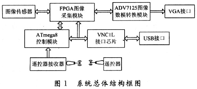 系统总体设计如下:图像通过VGA接口用显示器显示,显示速率可达25 f/s;系统可以将在显示器上看到的当前图像以位图的格式存储到优盘或其他USB设备中,并可以对存储的图像进行回显;用遥控器代替了按键的控制方式,可以在几米范围内用遥控器调节曝光、增益、十字线、存图和读图等所有功能,操作灵活方便。系统用美光公司的130万像素MT9T001作为图像传感器;Altera公司的FPGA芯片EP2C8Q208来完成图像采集和显示功能的控制,在实时浏览图像时,它从MT9T001中采集出Bayer阵列的黑白图像数据,然后将采集的数据用插值算法转换成24位RGB数据,由于采集图像的速度为40 MHz,而VGA显示的速度只有25 MHz,所以FPGA将转换完的数据放到SDRAM中缓存一下再送给驱动VGA显示的ADV7125芯片;ADV7125为ADI公司的高速数模转换芯片,将数字真彩色图像数据转换成可以用VGA接口传输的模拟视频信号;用Atmel公司的ATmega 8L芯片来完成遥控器的解码、读写USB设备的控制以及位图格式的创建等;用集成了文件系统的FTDI的VNC1L-1A芯片作为与USB设备通信的接口芯片,单片机加一片接口芯片完成USB的Host功能,省去了对文件系统的处理,节约了软件的开发时间。将这款带存储功能和遥控控制方式的图像采集系统应用到了工业领域,做成产品,作为工业众多工业相机中的一种。图1是其总体设计框图。