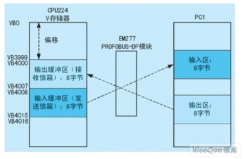EM277输出和输入数据缓冲区驻留在S7-200CPU变量存储器(V存储器)内,输入缓冲区紧紧跟随输出缓冲器。缓冲区的大小是由DP主站组态设定的(之前设定为8 Bytes Out/8 Bytes In)。组态后,EM277可接收从主站来的输出数据,并将输入数据返回给主站。主从站缓冲区的关系如图6: