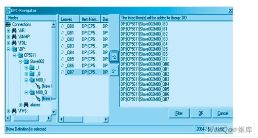 在PC1上打开SIMATIC程序组中的OPC Scout,新建一个组名。打开新建组的“OPC-Navigator”,在DP目录下的Slave002就是从站CPU224,M00_I和M00_Q即对应从站的输入和输出缓冲区。将M00_I和M00_Q目录下的变量按需求添加(如图7),确认后OPC就开始运行了。如果变量的“Quality”显示“good”,表示OPC Server程序已经通过PROFIBUS-DP总线协议和PLC建立了连接运行关系。此时不仅可以读取PLC中的数据,还可以向PLC写数据。