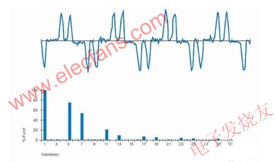 多数配电系统上的大部分非线性电力负载来自SMPS设备。比如,所有计算机系统使用SMPS把市电交流电压转换为供内部电子设备使用的稳定低压直流电。这些非线性电源会产生高振幅短脉冲电流,造成电流和电压波形严重失真——谐波失真,一般按总谐波失真(THD)衡量。该失真向后传播回到电源系统,将影响连接在同一电源上的其他设备。