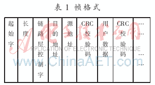 通信模块的通信协议根据DNP3.0规约制定,数据链路层的数据采用一种可变帧长格式:FT3。一个FT3帧被定义为一个固定长度的报头,随后是可以选用的数据块,每个数据块附有一个16 位的 CRC 校验码。固定的报头含有两个字节的起始字,一个字节的长度(LENGH),一个字节的链路层控制字 (CONTROL),一个16位的目的地址,一个16位的源地址和一个16位的CRC校验码,其帧格式如表1所示。