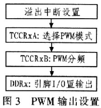 单片机定时器PWM输出设置如图3所示。首先需设置T/C中断屏蔽寄存器TIMSKx使能定时器溢出中断。其次分别设置T/C控制寄存器TCC-RxA和TCCRxB选择PWM模式和预分频比,最后将控制信号引脚I/0置为输出。程序运行时,每当定时器计数产生溢出,CPU响应中断,定时器回零后重新开始计数。