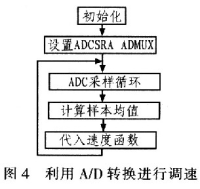 文中通过电位器调速试验来检测TB6612FNG的PWM控制与电机输出转速间的线性关系。单片机ADC对精密多圈电位器的电压值进行采样,用于控制电机转速。程序流程如图4所示。首先进行电机控制信号的初始化,接着通过设置ADC控制状态寄存器ADCSRA和ADC多路复用选择寄存器ADMUX选择ADC频率和通道,然后选取合适的样本数量,对ADC循环采样并计算样本均值作为当前速度值,代入速度函数。