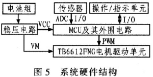 如图5所示,系统硬件电路主要由电源、控制、传感、电机驱动、操作与指示等单元组成。系统采用电池组供电,通过稳压电路输出VM和VCC2路电压。稳压电路主要由开关型稳压器LM2576和三端稳压器7805构成,前者能提供输出电流最高3 A的VM,对电机驱动等单元供电,后者将电源稳压至VCC(+5 V),对单片机及其外嗣电路供电。