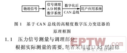 基于CAN总线的高精度数字压力变送器的原理框图如图1所示。该压力变送器主要包括压力信号测量与调理部分、数字处理部分、CAN总线传输部分。