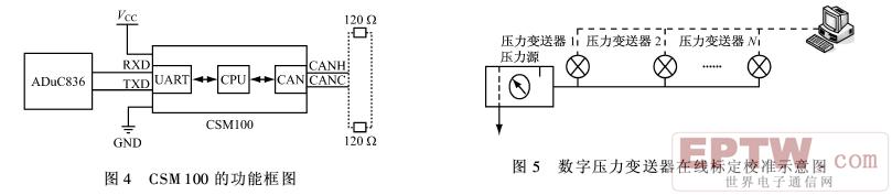 本文设计的压力变送器的CAN总线核心器件采用了CSM 1004{芯片。它内部集成完全电气隔离的CAN- bus接口电路,采用全灌封工艺,具有很强的抗干扰能力,大大提高了系统在恶劣环境中使用的可靠性,其主要功能是实现了UART一CAN之问的透明转换,用户不必深入了解CAN- bu、的相关知识,利用该芯片操作CAN- bus就如同操作UART一样方便。图4为CSM 100的功能框图。