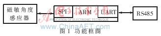 基于磁敏技术的位移传感器主要由3个部分组成,前端角度信号采集、数据处理单元、数据通讯单元,具体的功能框图如图1所示。