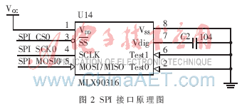 MLX90316具备1路SPI接口,用于角度信号的数据,由于串行通信的输出信号直接来自于内部DSP输出,SPI输出模式更稳定,误差更小,并且具有更高的抗干扰能力,在本设计中,选用SPI接口,具体的硬件接口连接电路如图2所示。在图2中,MLX90316的SPI 3根线与LPC2136的SPI0口连接。SPI(Serial Protocol Interface)总线接口是一种同步串行外设接口。这是一个4根信号线的串行接口协议,包括主、从两种模式。这4根信号线分别是:时钟线(SCK)、数据输入线(MISO)、数据输出线(MOSI)和从设备使能线(/SS)。
