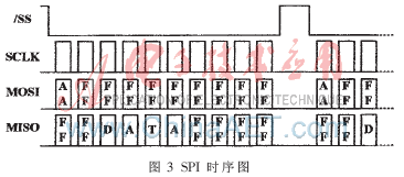 SPI接口中,LPC2136作为主控端,MLX90316作为从属端。SPI通信模块主要让LPC2136读取MLX90316的磁敏角度,SPI的通信过程为:主控端先输出一个0xAA以及一个0xFF作为通信起始信号,接着输出8个0xFF,而从端会同时输出2个0xFF、4 B的角度信号以及4个0xFF,从而完成一次数据通信。具体的通信时序如图3所示。