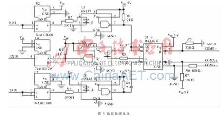 数据通信单元设计了1路RS485通信接口,负责接收来自应用系统的命令、向应用系统返回采集的位移结果。