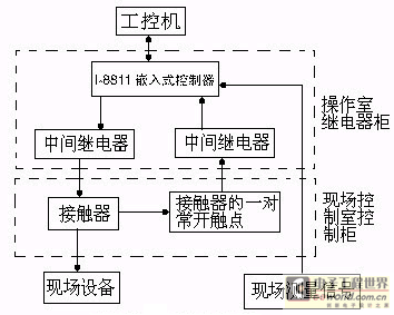 需要控制的设备有:循环液下泵或风机、倒水泵、加药计量泵、电动阀门原理:测量数据直接进入控制器中,各种电机的控制是由控制器的开关量输出控制中间继电器的吸合,再由中间继电器的常开触点控制现场控制柜的各回路的接触器动作,从而启动或停止各设备工作。同时接触器的一对常开触点闭合,反馈给继电器柜的输入继电器,中间继电器的触点作为控制器的开关量输入,输入给计算机用以判断设备是否可靠启动,以及判断设备的运行状态。