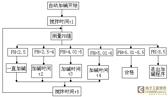 每次处理池处理的废水达几百吨,初始PH值相差很大,并且水中的沉淀物也不一样,很难采用传统的PID调节方式进行加碱。我们采用模拟人工加碱方式进行。加碱前使废水混合均匀,测量PH值,根据PH值加碱,混合均匀后再判断,直到水质合格。