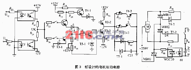 图3中,Ukp和Ukn分别为80C196的两个高速输出引脚,T2-1/T2-2、T3-1/T3-2、T4-1/T4-2、T5-1/T5-2、T6-1/T6-2、T7-1/T7-2分别为6个光电隔离器。当Uk为+5V高电平时,T2-1/T2-2导通,从而T*-1/T6-2导通使电机正转;当Uk由高电平到低电平的瞬间,T4-1/T4-2瞬间导通,使得T7-1/T7-2瞬间导通,电机瞬间反转,电容放电结束后电机停止;同理,当Uk为0V低电平时,电机反转。这样便实现了电机正反向控制。