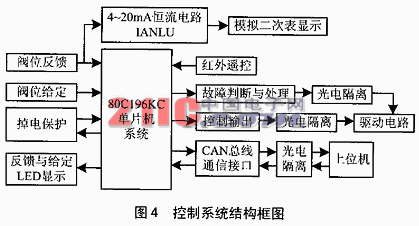 以80C196KC单片机为核心的全数字电动执行器的控制系统结构如图4所示。图4中,除80C196KC单片机外,还选用了X25043实现掉电保护功能,以MAX7219驱动LED数码管显示阀位的给定值与反馈值以及阀位的状态与控制方式;同时,以改进的4~20mA恒流电路直接将阈位反馈信号转换成4~20mA的信号送至室内模拟二次表显示,以保证其模拟与数字控制的兼容性。利用80C196KC内部的A/D转换口,将阀位反馈与阀位模拟给定信号转换成10位的数字信号,用软件判断阀位故障(堵转,超限),进行故障处理(报警或停机),在控制输出端与故障处理端用MOC3061光电隔离将单片机系统与电机驱动电路隔离开来,达到抗干扰的目的。