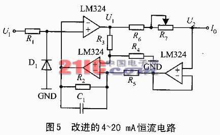 从图5电路可知:在R2、R3、R4、R5这四个电阻匹配得比较好的情况下,U1-U2=U1,通过调节R7使得R6+R7=250Ω,从而Io=U1/250Ω达到使1~5V电压转换成4~20mA的目的,且不论输出端的负载如何变化,这种关系都不会发生变化,达到恒流的目的。为为使该恒流电路可带的负载尽量大,集成运放LM324的电源最好用+18V电源。