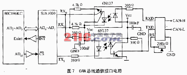 CAN的信号传输采用短帧结构,每一帧的有效字节数为8个,因而传输时间短,受干扰的概率低。当节点严重错误时,具有自动关闭的功能,以切断节点与总线的联系,使总线上的其它节点及其通信不受影响,具有较强的抗干扰能力。CAN总线通信接口电路如图7的示。