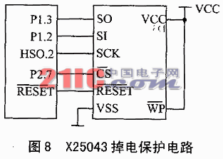 系统实现现电保护的元件采用Maxim公司的X25043。X25043有三种常用的功能:看门狗定时器、电压监控和E2PROM,组合在单个封装内。X25043对于要求电路板空间尽可能小的该系统来说是非常适用的,电路如图8所示。