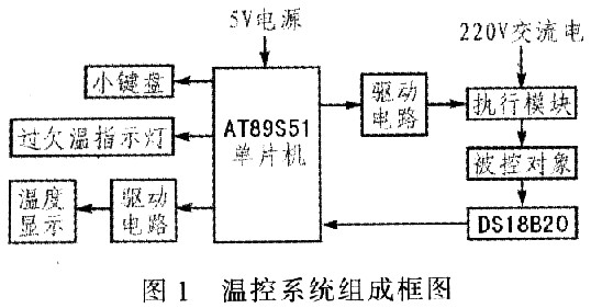 为实现被控对象温度的冷热调节,所设计的温度控制系统以AT89S51单片机作为控制核心,包括温度采样模块、温度显示模块、执行模块、过欠温指示模块以及小键盘等外同电路。系统时钟频率为12MHz,采用智能集成化器件DS18B20来监测被控对象,将温度值转换为带符号的数字信号,通过单总线输出,实现了温度采集、转换与变送的功能,有利于简化电路。考虑到单片机的直流输出驱动能力,采用三极管、74LS244和74LS07来驱动相应的外围集成电路。温度数据通过4个并行共阳极的LED动态显示,并自行搭建小键盘来实现被控对象目标温度的设定。执行模块利用固态继电器SSR进行光电隔离,实现小功率直流电控制220V交流电通断,使得控制加热管通断、风扇启停的继电器带电或失电,并采用大功率的风扇和加热管以实现有效的温度冷热调节。系统中采用不同颜色的LED灯指示系统的工作运行状态,红色发光二极管亮表示温度过高或过低报警,绿色发光二极管亮则表示系统工作正常。系统组成如图1所示。