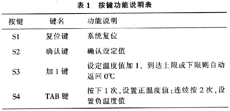 小键盘模块自行搭建,由复位键、确认键、加1键和TAB键等4个按键组成。键盘电路简单明了,满足设定被控对象目标温度的人机交互要求。各个按键的功能说明如表1所示。