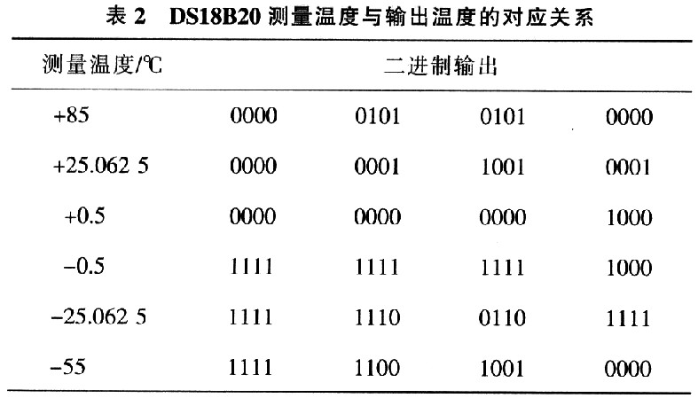 DS18B20测量温度与输出温度之间的关系如表2所示,输出温度为12位的二进制数,存储在DS18B20两个8位的RAM中,二进制数的前5位是符号位。
