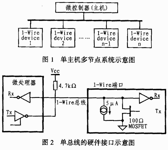 单总线适用于单主机系统,能够控制一个或多个从机设备。主机可以是微控制器,从机可以是单总线器件,它们之间的数据交换只通过一条信号线。当只有一个从机设备时,系统可按单节点系统操作;当有多个从设备时,系统则按多节点系统操作。图1所示是单总线多节点系统的示意图。