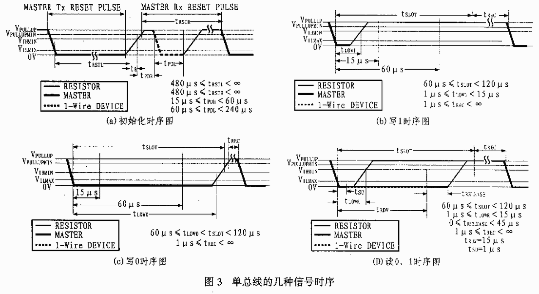 所有的单总线器件都要遵循严格的通信协议,以保证数据的完整性。1-wire协议定义了复位脉冲、应答脉冲、写0、读0和读1时序等几种信号类型。所有的单总线命令序列(初始化,ROM命令,功能命令)都是由这些基本的信号类型组成的。在这些信号中,除了应答脉冲外,其它均由主机发出同步信号,并且发送的所有命令和数据都是字节的低位在前。图3是这些信号的时序图。其中,图3(a)是初始化时序,初始化时序包括主机发出的复位脉冲和从机发出的应答脉冲。主机通过拉低单总线至少480μs产生Tx复位脉冲;然后由主机释放总线,并进入Rx接收模式。主机释放总线时,会产生一由低电平跳变为高电平的上升沿,单总线器件检测到该上升沿后,延时15~60μs,接着单总线器件通过拉低总线60~240μsμ来产生应答脉冲。主机接收到从机的以应答脉冲后,说明有单总线器件在线,然后主机就可以开始对从机进行ROM命令和功能命令操作。图3中的(b)、(c)、(d)分别是写1、写0和读时序。在每一个时序中,总线只能传输一位数据。所有的读、写时序至少需要60μs,且每两个独立的时序之间至少需要1μs的恢复时间。图中,读、写时序均始于主机拉低总线。在写时序中,主机将在拉低总线15μs之内释放总线,并向单总线器件写1;若主机拉低总线后能保持至少60μs的低电平,则向单总线器件写0。单总线器件仅在主机发出读时序时才向主机传输数据,所以,当主机向单总线器件发出读数据命令后,必须马上产生读时序,以便单总线器件能传输数据。在主机发出读时序之后,单总线器件才开始在总线上发送0或1。若单总线器件发送1,则总线保持高电平,若发送0,则拉低总线。由于单总线器件发送数据后可保持15μs有效时间,因此,主机在读时序期间必须释放总线,且须在15μs的采样总线状态,以便接收从机发送的数据。