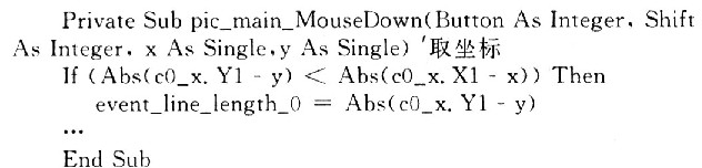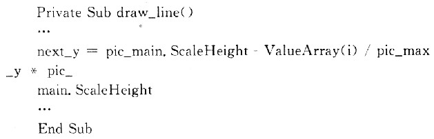画好绘图区及坐标系后,就要在绘图区绘制实时曲线,实时曲线的绘制一般借助于Timer控件来完成,使用Timer控件,定期将串口或是其他仪器中监测到的数据送往pic_main,而曲线的绘制一般画成折线图,采用PictureBoxl的Line方法绘制。用Line方法可以在窗体或图片框上绘制一条直线或绘制一个矩形。
