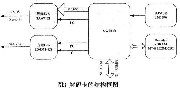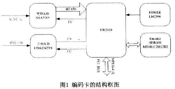 编码卡的结构如图1所示,主要包括音视频A/D、压缩芯片VW2010及其所需SDRAM,以及电源时钟等模块。