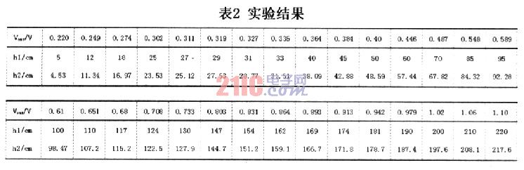 系统测试方法为:模拟地下水环境,在水深约为2米的水槽中进行测试。测试前将传感器接入,在不放入水中时,调节可变电阻使得系统显示水位为0cm,取定量的水槽水样进行标定。表2为实验数据,其中h1为标尺读数,h2为显示读数。