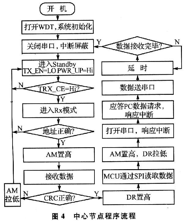 中心控制节点一方面要和该区域内的所有无线传感器节点配合,另一方面还要和PC机通信,根据需要把温度数据显示出来。据此,中心控制节点的程序设计如图4 所示。