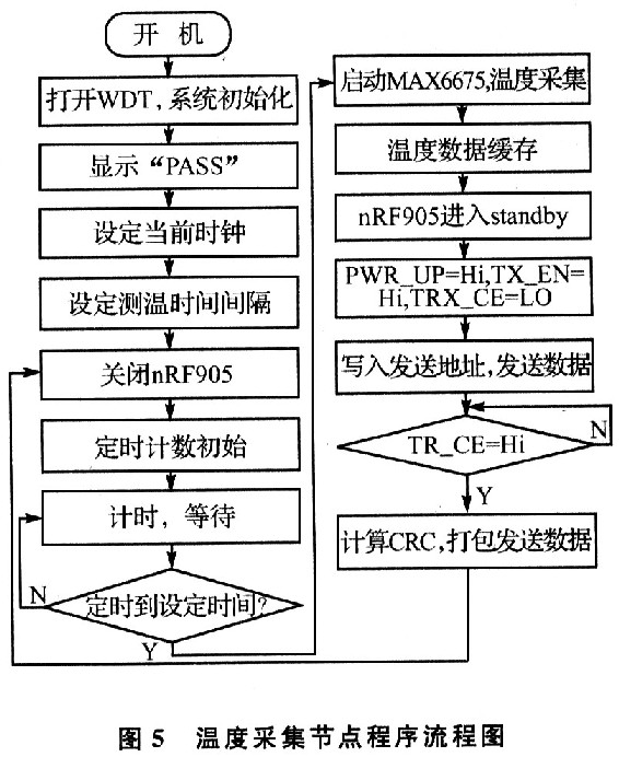 温度采集节点在设定时间完成温度数据采集及存储,并由无线收发器nRF905将该温度数据发送给中心控制节点。温度采集节点的程序设计如图5所示。