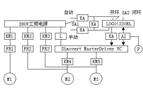 变频手动运行:系统还可以手动调节变频器输出。将SA2开关置于“开环”侧,变频器只控制M2,转速由人工调节电位器进行调节,M3泵不投入运行。如变频系统出现故障后,LOGO!230RL自动投运备用泵M1。