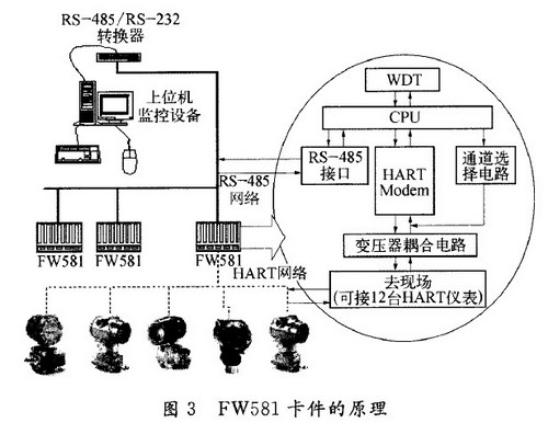 FW581的原理框图如图3所示。硬件电路主要包括:中央处理器(CPU)、HART调制解调器(Modem)及耦合电路、与现场仪表的信号选择及隔离电路、RS一485接口电路、WDT电路等几个部分。
