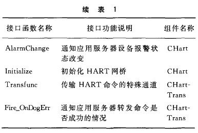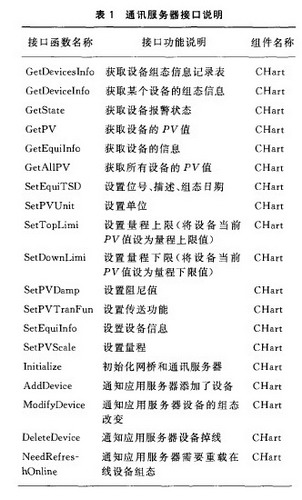 与HART协议通信装置配套的HART通信服务器软件,包括COM 服务器和OPC服务器。COM 服务器实现与HART 网桥的串行通讯,向HART网桥下发对仪表基本信息和过程变量的读取命令,接收并处理HART网桥传上来的仪表过程变量和报警信息;并且支持向下转发特殊的HART协议命令,实现对现场HART仪表的组态和监控。OPC服务器将现场HART仪表信号传输到OPC服务器工作站。HART Server通讯服务器接口说明见表 1所列。