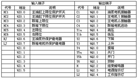 液压打包机控制系统由核心控制单元PLC和用于操作的人机界面组成,核心控制单元应用和利时公司的G3系列小型一体化PLC,人机界面采用深圳人机电子有限公司的新一代文本显示器MD204L。PLC包括1块24点CPU模块LM3107和1块8路继电器输出模块LM3222,输入、输出信号详见表1。