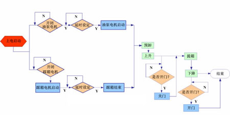 卸控制回路:按照工艺要求,预卸控制必须是在上升或提箱时间段以前进行。预卸全过程完全由PLC程序自动进行,油缸上升时即为预卸工序开始。读取文本显示器上的油缸上升缓冲延时继电器的时间设定值,同时开始计时,时间到预卸结束。