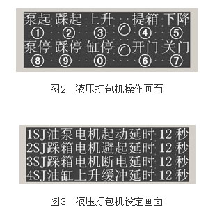 采用PLC控制的液压打包机可以实现自动脱包、自动提箱、自动转体、自动踩棉等功能,并能对生产过程进行实时监控,完成自动诊断、自动报警和数据上传等功能。为提高电气控制系统的可靠性,根据客户的实际需求,将经常出现故障的所有可以替换的开关按钮全部转移到人机界面上,包括油泵的启动/停止、踩箱的启动/停止、油缸的上升/下降/停止、提箱、开门、关门等操作按钮。另外,时间继电器的时间也在人机界面上设定,包括油泵电机启动延时继电器、踩箱电机避起延时继电器、踩箱电机断电延时继电器和油缸上升缓冲延时继电器。