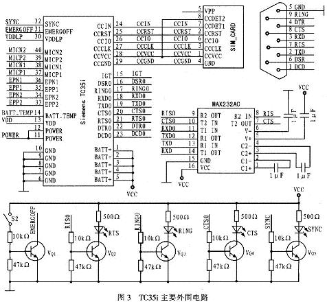 ZIF40PIN的引脚1~14为电源部分,其中引脚l~5为电源电压输入端VBATT+,引脚6~10为电源地GND,引脚11~12为充电端,引脚13为对外输出电压(供外部电路使用),引脚14 ACCU/TEMP接负温度系数的热敏电阻;引脚24~29为SIM卡连接端;引脚33~40为语音接口用来接电话手柄。引脚15、30、31和32为控制部分,引脚15为启动线IGT(Ig-niTIon)。当TC35i通电后必须给IGT一个大于100 mV的低电平,模块才能启动。引脚30为RTC back up;引脚3l为掉电控制:引脚32为SYNC,引脚16~23为数据输入/输出端。TC5i无线通讯模块的主要外围电路的连接如图3所示。数据通信电路以MAX232为核心实现电平转换及串口通信。
