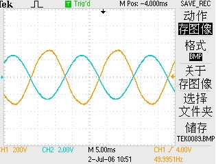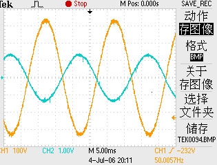 图3,图4分别是网侧电压电流波形图,图3是并网电流为60A时的网侧电压电流波形图;图4是并网电流为100A时的网侧电压电流波形图,从两图可以看出,网侧电流正弦化,且与电网电压反相,呈现负的单位功率因数,同时也能观察到随着电流的增大,网侧电流的总谐波(THD)越来越小,即整体效率也越来越大。