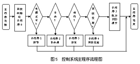 主程序首先是初始化。PLC开机首次扫描,运行开机初始化子程序,通过调用该程序完成系统存储器有关数据的初始化。然后是电源和故障检测输入部分。如果电源关闭,则程序运行直接转向结束,程序执行完毕;如果电源打开,则程序开始检测故障输入。如果没有故障,则继续下面的扫描;如果发现故障,则调用报警子程序,然后程序转向结束,程序执行完毕。然后是自动/手动选择。手动操作仅用于调试设备,而自动操作才用于生产。如果是手动,则调用手动操作子程序。接下来是运行与停车判断。当输入是停车时,则程序执行停车子程序;当输入是运行时,则程序执行运行过程。紧接着就是变速操作。如果系统给定发生变化,则运行变速子程序,使系统不断靠近而最终达到新的系统速度。最后是张力的PID调节部分。该部分通过控制2台磁粉制动器和2台直流电动机,完成系统的张力控制。
